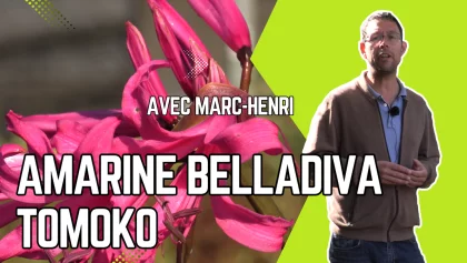 Marc-Henri nous présente la variété ‘Tomoko’ qu’il trouve très spectaculaire. En plaçant les deux pots côte à côte, on peut aisément observer tout l’intérêt de l’hybridation !