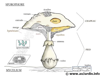 Ni végétal, ni animal, le champignon a des stratégies de développement, de reproduction, qui lui sont propres. On observera chez la plupart des familles un mycélium, partie végétative, souvent invisible; puis une partie reproductive, le sporophore, "fruit" de nos récoltes. Si les formes de mycélium varient peu, celles du sporophore semblent infinies: microscopiques, en coupelles, coralliennes... Mais attachons-nous à l'anatomie du champignon de nos assiettes.