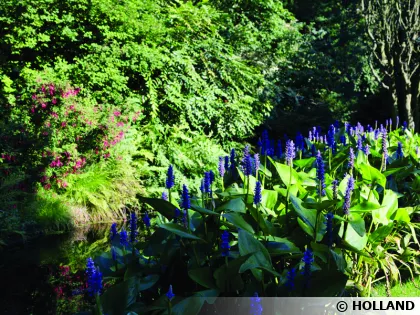 La fameuse allée des Hostas suivant le canal central et traversant le jardin de part en part a, quant à elle, été crée en 1993. Elle présente comme son nom l'indique, plus de 500 variétés de hostas aux feuillages étonnants, tantôt bleutés, tantôt panachés qui partagent la vedette avec une belle collection de houx et de rhododendrons. Ces derniers sont partout présents dans le parc qu'ils émaillent de leurs floraisons splendides au printemps. Là encore c'est plus de 700 variétés qui ont été réunies au sein du jardin sans compter la centaine de cultivars d'azalées.