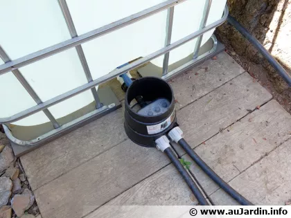 L'arrosage automatique par gravité nécessite de disposer d'un réservoir d'eau de pluie ou d'une cuve remplie régulièrement d'eau lors de votre présence intermittente. De son volume dépendra votre autonomie. Une cuve d'un mètre cube type IBC est un bon point de départ et vous assurera plusieurs semaines d'arrosage selon votre surface à couvrir. En reliant plusieurs cuves vous augmenterez cette autonomie.