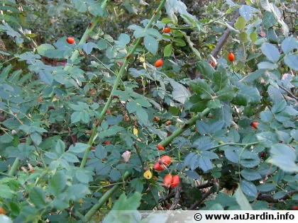 Rosa canina est un joli arbrisseau d'environ 3 mètres de haut, aux robustes tiges dressées recouvertes d'aiguillons en forme de faux, très répandu dans les haies, les buissons ou les champs non cultivés.