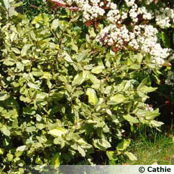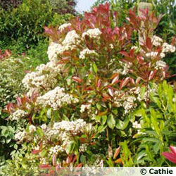 Eleagnus limelight. Sa croissance est lente, mais son feuillage original. Il donne une note de couleur tout au long de l'année. | Photinia 'red robin', en fleurs. Ses nouvelles pousses sont rouges, puis deviennent vertes et il fleurit en mai. |