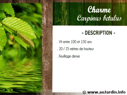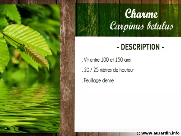 Le charme est un arbre de forêt qui peut vivre entre 100 et 150 ans. Sa croissance est lente et il peut atteindre, parfois, 20 à 25 mètres de hauteur. C’est une essence qui apprécie les expositions semi-ombragées et qui tolère bien le couvert des grands arbres.