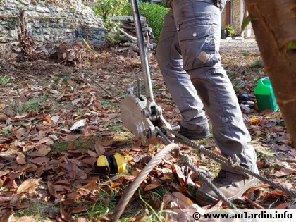S'il vous devez arracher une souche, il faudra creuser une tranchée tout autour de celle-ci et couper à leur départ les grosses racines pour pouvoir fixer la sangle efficacement et faciliter l'accroche.