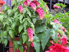 J'ai eu la surprise cet été de voir se développer dans mes jardinières, un plan de bélopérone ou plante crevette dont un pied mère était hiverné près d'un pélargonium. Il s'est développé superbement à l'extérieur et est resté fleuri jusque fin octobre.