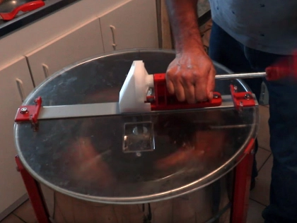 Les cadres sont ensuite positionnés dans l'extracteur et la centrifugeuse est actionnée à l'aide d'une manivelle durant 5 minutes. Le miel est alors projeté sur les parois de l'extracteur. Une fois les cadres vides, on ouvre le robinet situé au bas de l'extracteur et on récupère le miel dans un seau.