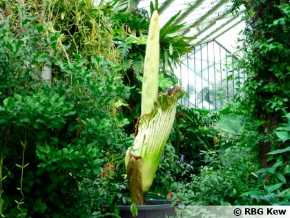 Voilà une plante qui cumule les records ; celui de la plus haute inflorescence et de la pire odeur du monde végétal ! L’Arum titan (Amorphophallus titanium ) est une plante bulbeuse qui pousse en lisière de la jungle de Sumatra. Le bulbe pèse à lui seul plus de 70 kg, il produit au bout d'une dizaine d'années, une inflorescence spectaculaire qui restera ouverte seulement 72 heures et pouvant atteindre 2,70 mètres de hauteur. L'odeur fétide qu'elle dégage se propage sur 800 mètres à la ronde afin d'attirer un maximum de pollinisateur en un minimum de temps.