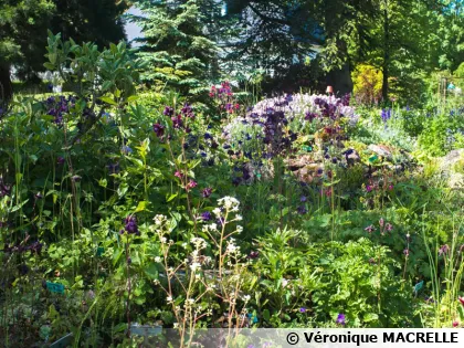 De rocailleux, le jardin se glisse dans l’exubérance et le foisonnement en rapprochant de la fraicheur occasionnée par le canal qui longe le mur de la citadelle. En zone humide, immergeable, les plantes aquatiques grossissent, grandissent, fleurissent, offrent l’abondance. Un magnifique massif de Darmeria peltata se reflète dans l’eau, les iris aquatiques s’en donnent à cœur joie, le trolle d’Europe épanouie ses corolles rondes et dorées. Au plus près du chemin, les fritillaires pintades et les primevères candélabres profitent aussi de l’humidité. Une peu plus en amont, en terrain frais, mais moins humide, trônent Glaucidium palmatum, remarquables papavéracées aux grandes fleurs mauves, des Iris setosa, un superbe Symphytum caucasicum surgit au milieu des fougères. En pelouse fraiche, plus ensoleillée, Dactylorysa fuchii, une belle orchidée terrestre pourpre s’est naturalisée.