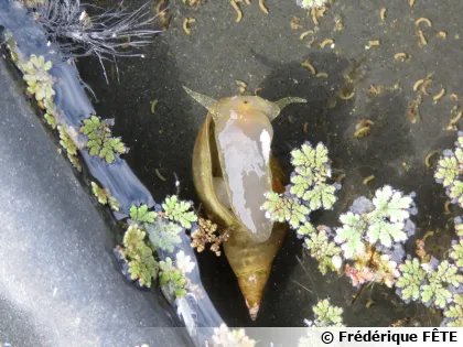 De taille remarquable, son élégante coquille enroulée en longue pointe, la grande Limnée sillonne les mares de son glissement tranquille.