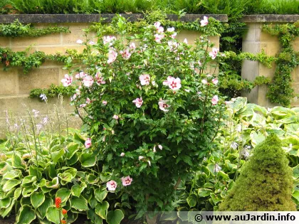 Hibiscus syriacus, autrement nommé 'Mauve en arbre' ou 'Althéa' est un arbuste au port dressé et au feuillage caduque vert foncé. Cette espèce est originaire d'une zone qui s'étend de l'Inde à la Chine, où elle peut atteindre près de 3 mètres de hauteur pour 2 mètres d'étalement. Les fleurs rose foncé à centre pourpre en corolles de 8 cm de diamètre se succèdent sans discontinuer de juillet aux premières gelées. D’innombrables variétés ont été créées, à fleurs doubles comme chez 'Jeanne d'Arc' de couleur blanche ou 'Leopoldii' rose taché de rouge. Les variétés à fleurs simples les plus classiques sont 'Blue bird' dont les fleurs bleu/mauve présentent un centre rouge, ou encore 'Hamabo' aux grandes fleurs rose pâle tachetées de rouge.