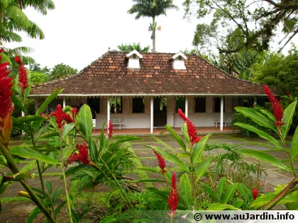 L'entrée bordée d'alpinias conduit tout droit à une ancienne petite maison créole en bois à toit pagode. Si le lieu est si attachant c'est qu'il s'articule non pas sur une collection botanique stricte et ennuyeuse mais plutôt sur un enchaînement d'ambiances diverses et poétiques.