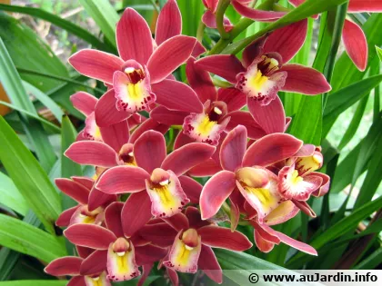 De grande ampleur, cette orchidée forme de belles touffes très florifères. Très facile de culture, elle peut même être maintenue à l'extérieur dans les régions où il ne gèle pas. Elle tolère d'ailleurs très bien la chaleur et même le soleil direct si l'humidité de son substrat et de l'air est suffisante. Attention à ne jamais laisser d'eau dans la coupelle, mais maintenez le terreau toujours humide. Si le cymbidium est cultivée en intérieur, fournissez-lui une très bonne luminosité et ménagez un repos hivernal entre 12 et 15°C. pour induire à la fois une nouvelle floraison et empêcher les boutons de tomber une fois formés. Vous pouvez placer cette orchidée sur une large coupelle remplie de billes d'argile maintenues humides afin d'augmenter le taux d'hygrométrie surtout si votre appartement est chauffé.