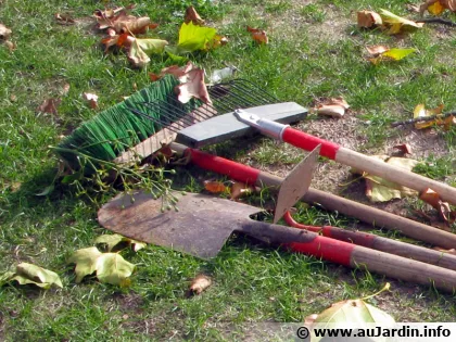 Parmi les outils indispensables, citons l'éternel ami du jardinier : le râteau ! On ne le présente plus. Ses multiples dents plus ou moins carrées et épaisses servent à retirer de la surface du sol les débris végétaux et les cailloux. Il est aussi très utile en finition pour niveler le sol, sa largeur de 40 cm permet d'aplanir celui-ci sur une grande surface à la fois. Le ratissage assure une terre fine et plane pour y effectuer des semis ou des plantations.