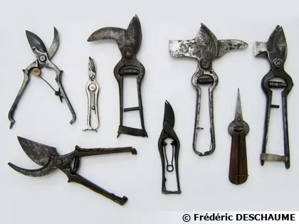 Produit encore récent sur le marché de l'outillage rural, les fabricants s'ingénièrent à créer de nombreux modèles; l'acier forgé et trempé est gage de robustesse et de coupes relativement nettes. Recherche de confort, envie de luxe ? les branches sont habillées d'os, de corne ou de bois nobles. La rivalité des différents systèmes de ressort ajoute à la diversité. La photo n° 2 ne présente qu'un bref aperçu des instruments que nos aïeux employaient. Le plus grand, à droite, mesure 30 cm, et le plus petit, pour les dames, 15 cm.
