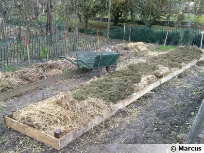 La paille est utilisée au potager pour pailler le pied des plantes sensibles à la pourriture. Les feuilles et les fruits ne seront ainsi pas au contact avec le sol. En cas de pluie, les végétaux ne seront pas souillés par la terre. Cette technique est notamment utilisée pour la culture des fraisiers, des courgettes, des melons ou des concombres. La paille, plus dure et plus piquante que le foin constitue aussi une bonne barrière contre les limaces et les escargots qui auront du mal à progresser dessus. Sans oublier qu'un sol couvert d'une bonne épaisseur de paille aura moins besoin d'être arrosé, car ainsi protégé des rayons solaires, l'évaporation sera moindre. Moins de sarclages et de binages en perspective, car les herbes indésirables ne pourront plus pousser !