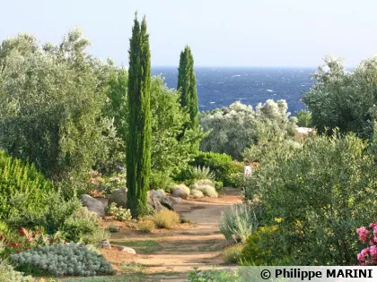 Disposé en étoile, le 'Jardin des 4 couleurs', dont la minéralité est savamment compensée par un jeu de fontaines, est inspiré par l'atmosphère que l'on peut retrouver dans les villages corses notamment dans les cours secrètes qui les composent. Ces jardins donnent sur le 'sentier sauvage', joyau bordant le bleu de la mer. Chênes verts et oliviers protègent les anciennes terrasses de culture de leur ombrage bienfaisant. Là encore, vous irez à la rencontre de petites merveilles végétales qui attirent de nombreux insectes pollinisateurs et une faune toujours plus nombreuse. Le chemin rejoint l'intérieur du parc par le biais d'une splendide allée de lauriers roses très caractéristiques de la zone méditerranéenne.