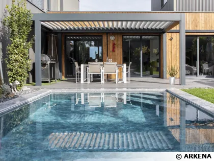 S'adaptant parfaitement aux dimensions d'une terrasse, la pergola bioclimatique se décline en de multiples options. Contemporaine, elle s'intègre avec élégance au bâti existant assurant un abri délicatement ventilé et un prolongement à la fois esthétique et pratique.