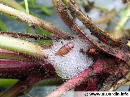 Au printemps, les œufs, qui étaient en diapause, éclosent, libérant de petites larves qui commencent immédiatement à se nourrir de la sève des plantes. C’est à ce stade que celles-ci produisent leur mousse protectrice.