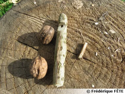 Fruit d'automne, la noix se perce comme le noyau d'abricot, ou se décalotte en son sommet, en soufflant dans la cavité nettoyée, on obtient un son d'autant plus aigu que le trou est grand. Mais la noix peut aussi devenir une toupie siffleuse. Le fruit choisi doit être le plus régulier possible, bombé. Un trou est percé sur une extrémité pour fixer un bâtonnet (colle ou cire). Un autre trou, le siffleur, se situe sur le côté, face bombé. Une ficelle est enroulée sur le bâtonnet, la pointe de la toupie posée sur une table. Une planchette verticale est calée contre le bâtonnet, la ficelle circulant par un trou percé en son centre. D'un coup sec, la ficelle est déroulée, la noix se met à tourner et siffle. Le jouet rejoint l'instrument de musique.