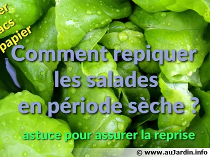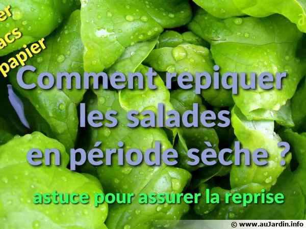 hydrater les salades à repiquer en les bassinant dans de l’eau pendant 1 heure, juste avant le repiquage ou prélever les salades à transplanter le matin, lorsqu’elles sont gorgées de l’humidité de la nuit.