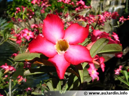 Le caudex est surmonté de tiges grêles et succulentes présentant à leurs extrémités des groupes de feuilles vert lustré. Clou du spectacle : les fleurs, semblables à celle du laurier rose (qui fait partie de la même famille botanique) peuvent atteindre 5 cm de diamètre. Carmin, roses ou blanches, elles couvrent la plante en été.