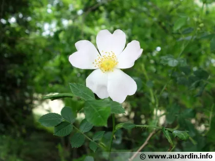 Rosa canina est l'espèce la plus répandue en Europe. Ce rosier est plus connu sous l'appellation 'd'Eglantier'. Les fleurs parfumées à souhait sont simples et blanches, elles entourent des étamines jaune d'or. Ce rosier vigoureux est un excellent porte-greffe car il s'adapte à de nombreux types de sols.