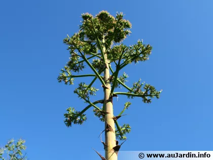 Au bout d'une quinzaine d'années de vie, vous verrez apparaître une drôle de tige conique au centre de votre agave. Vous constaterez sa vigueur et sa croissance très rapide. La tige va alors croître de plusieurs mètres en quelques mois pour atteindre une hauteur totale d'environ 10 mètres. Elle va ensuite se ramifier et portera des panicules étalées de fleurs verdâtres sans grand intérêt esthétique. Cette floraison intervient en été et peut durer plus d'un mois. Peu à peu, de nombreuses plantules viendront compléter le tableau au bout de la hampe florale.