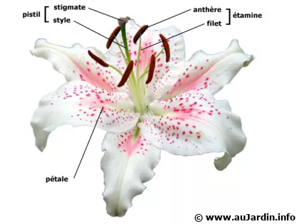 Bordées de pétales et de sépales, les étamines (organes mâles) composées d'un filet surmonté de l'anthère renfermant le pollen, entourent le pistil composé d'un ou plusieurs carpelles. Un carpelle est un ensemble d'organes femelles comprenant le stigmate, réceptacle de pollen, le style qui relie l'ovaire au stigmate et bien sûr les ovaires.