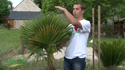 Pour protéger un palmier du froid, il existe une méthode spécifique qui consiste à regrouper les feuilles autour du bourgeon apical (le cœur) et les lier avec un lien non coupant. Cette protection hivernale est suffisante pour des palmiers rustiques de type Trachycarpus fortunei.