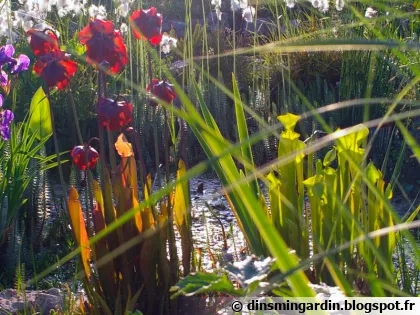 Les plantes carnivores poussent en zone humide, voire parfois inondable. De magnifiques espèces sont rustiques et résistent à - 25°C, telles que les Sarracenia. Comme j’aime les jardins qui ont une allure naturelle, j’ai eu l’idée d’installer mes plantes carnivores dans mon bassin.