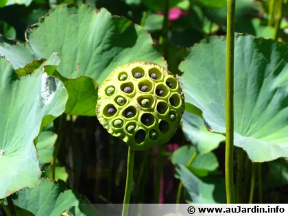En été les feuilles incurvées servent de transats aux grenouilles et autres libellules, alors que les fleurs somptueuses ne cessant d'être admirées par le jardinier émerveillé sont visitées par les papillons et les autres insectes pollinisateurs. Très étonnant et graphique, le fruit du lotus se forme à partir du réceptacle de la fleur qui de jaune vif passe alors au vert et entame un processus de croissance exponentielle jusqu'à ressembler à une petite pomme d'arrosoir ! Très graphique, ce fruit une fois séché et devenu brun foncé peut être utilisé dans les bouquets secs.