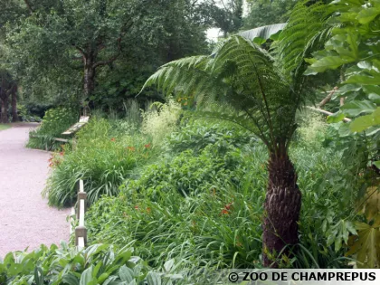 Le parc zoologique de Champrepus est organisé autour de 5 jardins thématiques particulièrement réussis. La visite débute avec le jardin exotique de l'accueil où sont exposés des batraciens entourés de bambous, de bananiers et de palmiers de Chine. Viennent ensuite la mini-ferme où l'on rencontre de nombreuses espèces domestiques de nos régions (chèvres, âne du Cotentin et du Poitou, poules...).