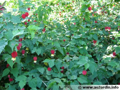 Les fleurs sont nombreuses, et s’épanouissent de juin à octobre, pendant harmonieusement de l’aisselle de chaque feuille sur les branches ployées, mais peu visibles si on laisse l’abutilon du grand fleuve ramper. Les fleurs sont en forme de lanterne chinoise, avec un calice rouge vif, d’où émerge une corolle jaune crémeux, peu ouverte.