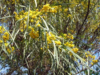 Acacia retinodes ‘Glauca’ : avec des phyllodes plus courtes, au bout arrondi, et une saison de floraison concentrée en avril/mai.