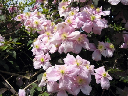 Clematis montana ‘Rubens Superba’, fleurs rose pâle et feuillage pourpré au printemps