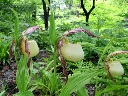 - Cypripedium pubescens, jaune et brun Cypripedium tibeticum, plante trapue aux fleurs sombres