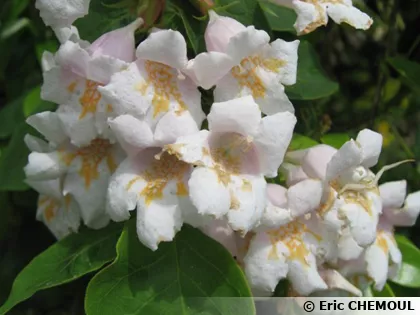 Cet amateur de soleil et de chaleur est remarquable par sa foisonnante floraison blanche parfumée, s'épanouissant de mai à fin juin en fleurs pendantes isolées ou regroupées en petits bouquets. Mesurant entre 1 et 3cm, en forme d'entonnoir campanulé tubulaire, leur corolle est dite bilabiée : la lèvre supérieure possède deux lobes et la lèvre inférieure trois. Si la fleur est blanche à rose clair, son coeur est ponctué de jaune orangé. Autour des fleurs on retrouve des bractées qui grossissent avant la fructification.