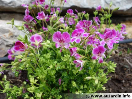 Pelargonium vitifolium est un sujet au port érigé formant une large touffe pouvant atteindre 80 cm de hauteur. Il apprécie les sols calcaires et fleurit sans interruption de juin à novembre mais n'est pas très rustique. Le feuillage arbore une belle teinte vert pomme et dégage de forts effluves de citronnelle dès qu'il est effleuré. Les fleurs roses au centre pourpre ne cessent de se développer de juin à octobre.