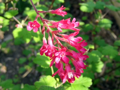 Au début du printemps, alors que les feuilles du groseillier à fleurs viennent juste d'apparaitre, éclot une myriade de petites fleurs roses regroupées en grappes pendantes.