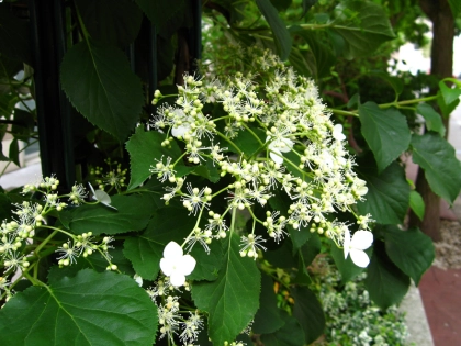 L'Hydrangea petiolaris est une belle grimpante qui s'accroche toute seule sur les murs les plus lisses et parvient à couvrir des surfaces importantes. Il porte une abondance de fleurs vaporeuses, très décoratives au début de l'été et se pare de jolies couleurs d'automne. C'est une plante de culture facile, d'aspect assez original, qui vient fort bien à l'ombre et résiste très bien au froid.