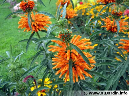 Arbuste étonnant à la floraison orangée très originale, le leonotis toujours spectaculaire, fera son effet aussi bien dans les massifs qu'en potées.