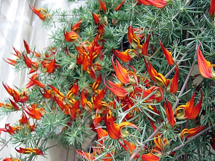 Les fleurs vives explosent de couleur sur le feuillage clair. Bien que de structure typique des Fabacées, ces fleurs ne ressemblent pas à celles des pois : la corolle montre deux pièces florales effilées, se terminant en pointe recourbée, couleur feu : rouge vif, ou jaune orangé. Ces fleurs sont nombreuses, de 4 à 5 cm de longueur ; elles sont dressées au-dessus du feuillage, comme autant de petites flammes.