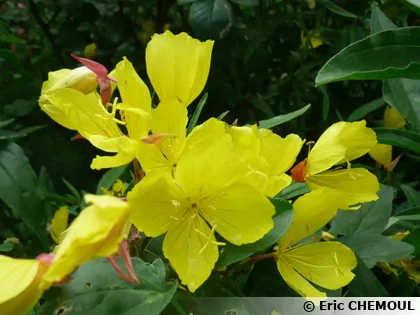 - Oenothera fruticosa 'Yellow River', aux tiges rouges prononcé et aux immenses fleurs jaune canari de plus de 5cm de diamètre