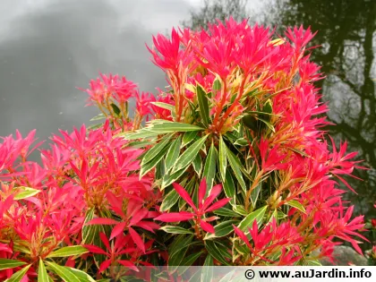 - Pieris 'Forest Flame' a un feuillage fin qui est rouge quand les feuilles se développent