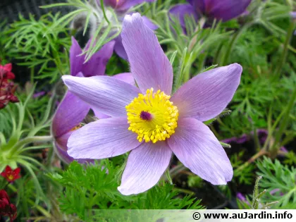 - Pulsatilla vulgaris ‘Rubra’ des fleurs rouges