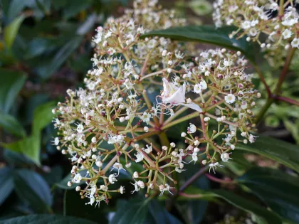 Viburnum cinnamomifolium, la viorne à feuilles de camphrier est un arbuste de taille modérée appartenant à la famille des Caprifoliacées. La viorne à feuilles de camphrier est originaire d’Asie, présente en massif forestier ouvert, dans le Sichuan et le Yunnan, entre 1000 et 1500 m. elle fait partie des viornes à feuillage persistant et ressemble un peu à Viburnum davidii : elle est moins compacte mais supporte mieux les climats plus chauds. Comme de nombreuses viornes, celle à feuilles de camphrier est une plante facile et belle, utilisable en haie comme en isolé.