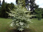 Chaque extrémité de branches porte au mois de mai un ou plusieurs panicules plats qui regroupent de nombreuses petites fleurs blanches.